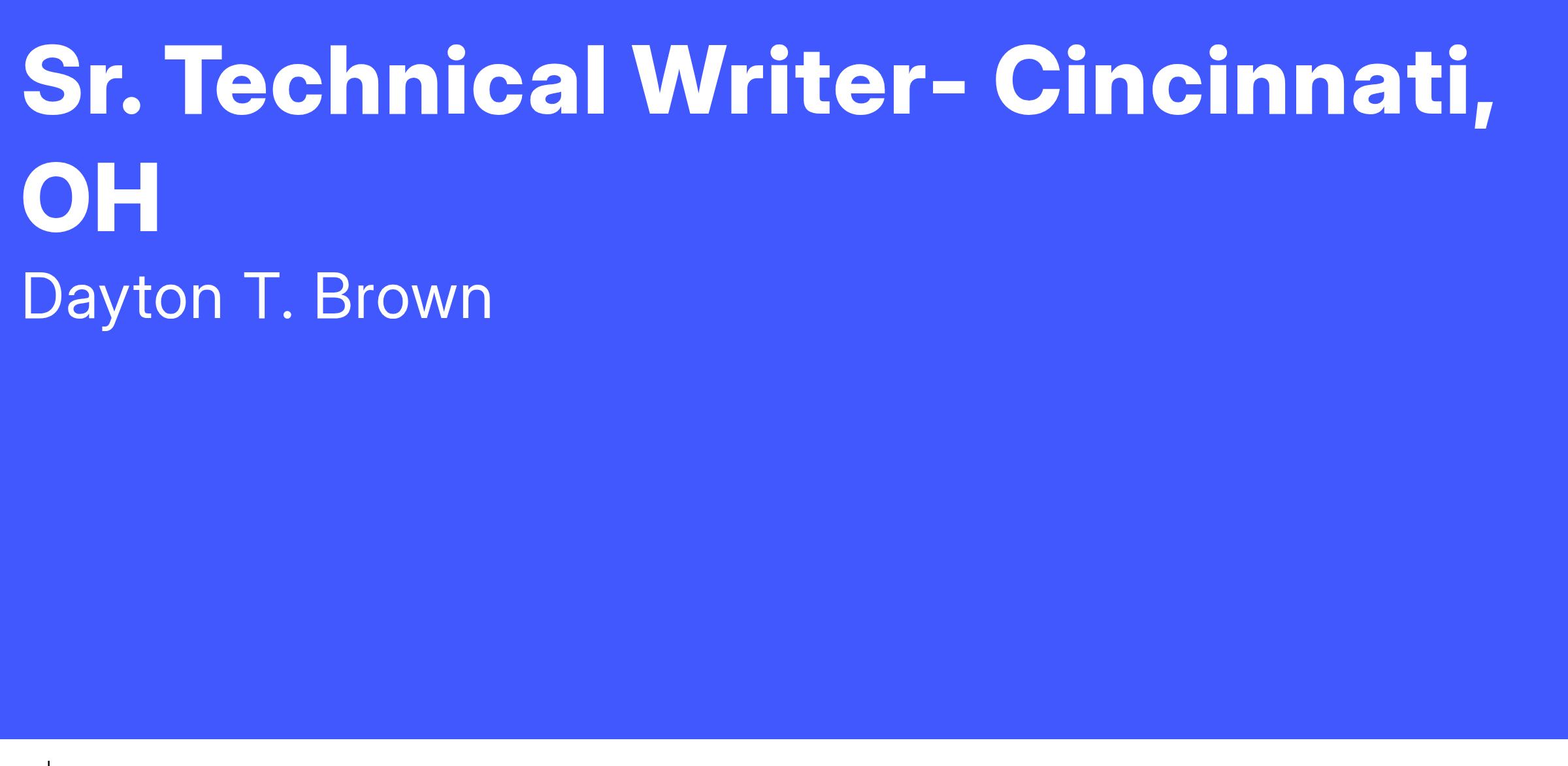 If you're ready for the challenge of working for a dynamic organization, Dayton T. Brown, Inc. has a career opportunity for a Senior Technical Writer to join our growing Technical Publications Division. Our three divisions, Engineering and Test, Technical Services, and Mission Systems, make DTB a diverse and welcoming place to work and thrive.